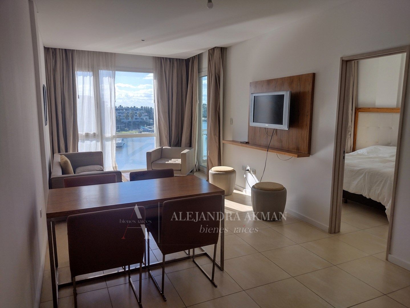 Departamento alquiler anual/temporal, amoblado con un dormitorio en suite en Condominios del Wyndham en Bahía Grande Nordelta vista al agua.. Living comedor con balcón. Cocina integrada con barra desayunadora. Toilette. Dormitorio en suite con baño completo, placard y balcón. Cochera cubierta. El departamento se entrega amoblado y equipado. No incluye ropa blanca. El edificio cuenta con seguridad y gimnasio Consultar valor por canon locativo según mes del año, más gastos de expensas, municipal, cable e internet, servicios, limpieza de salida. Las medidas son aproximadas y fueran suministradas por los dueños. Todas las Operaciones Inmobiliarias son concluidas por Alejandra Akman CMCPSI 7086